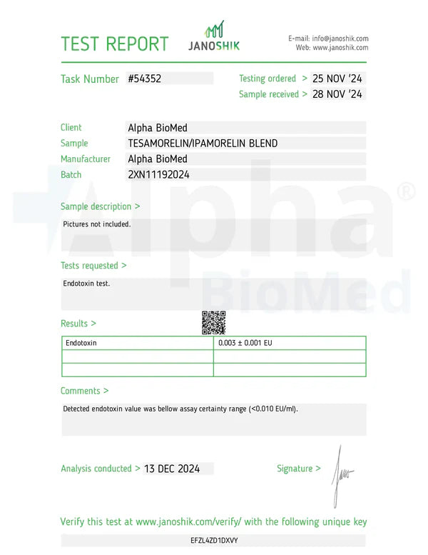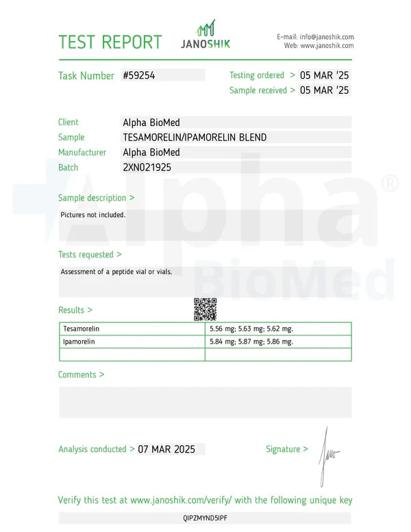 - A balanced blend of Tesamorelin (5mg) and Ipamorelin (5mg) designed to enhance growth hormone (GH) secretion, supporting fat reduction, muscle growth, and overall metabolic health.